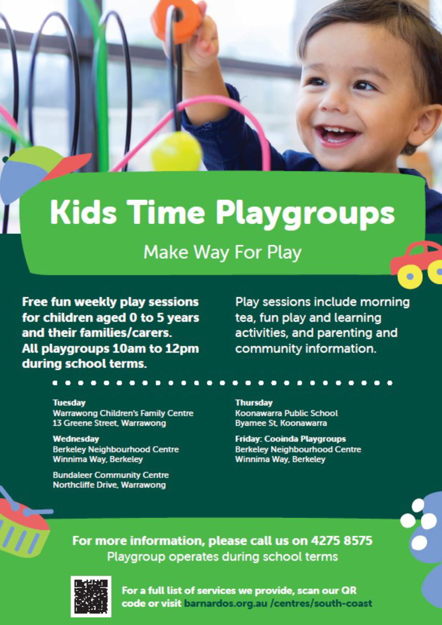 Barnardos Supported Kids Time Playgroup offers a free, fun weekly play session for children (0-5) and their families/carers. It is a great way for both you and your child to connect, find support, and engage with the wider community.