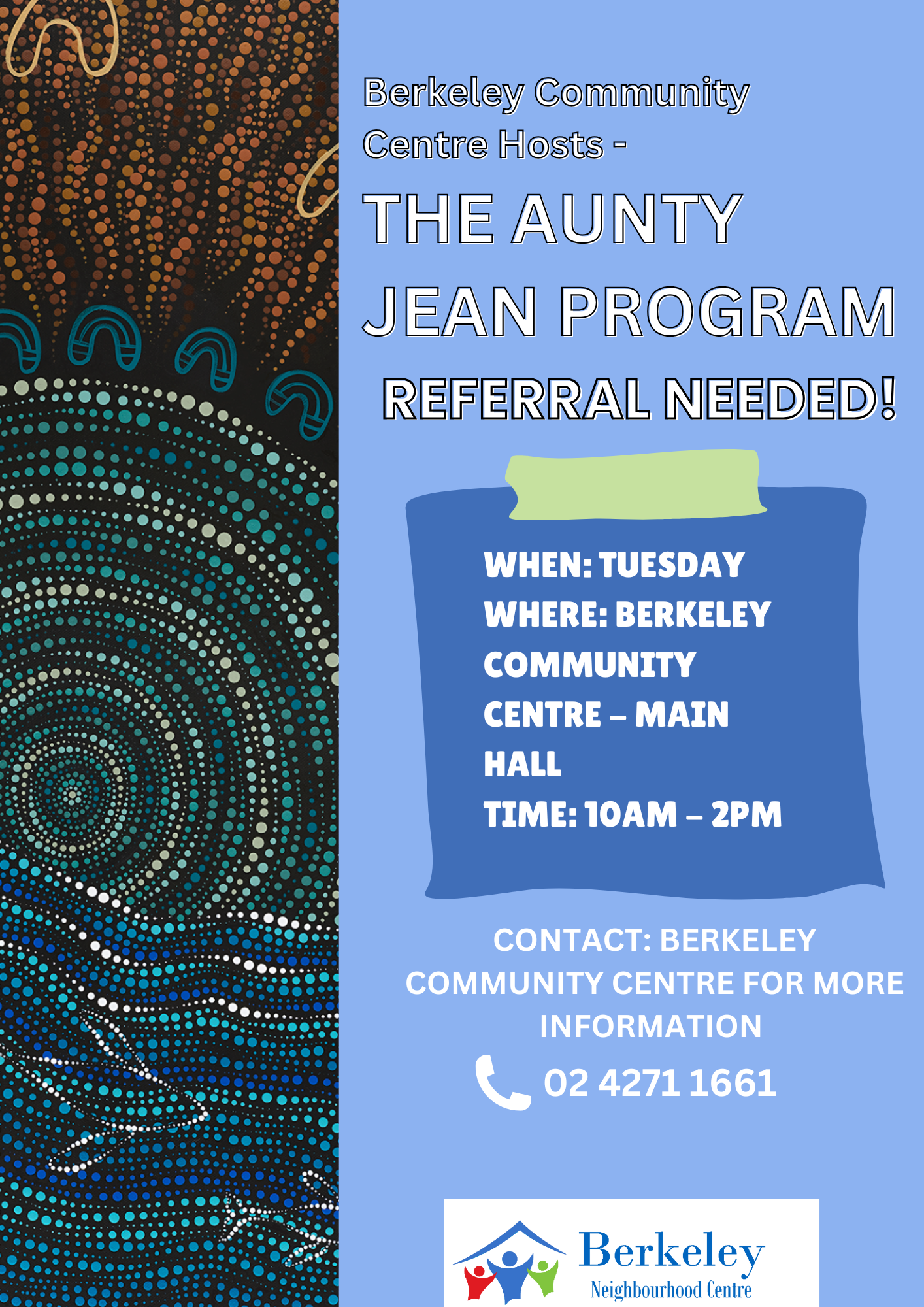 Referral needed! Please contact 02 4271 1661 for more info :) Aunty Jean's program offers a welcoming and culturally rich space for Aboriginal community members to connect, share, and celebrate their heritage. It's a program to promote physical, mental and emotional wellbeing in a culturally safe environment. Always was, always will be, Aboriginal Land!